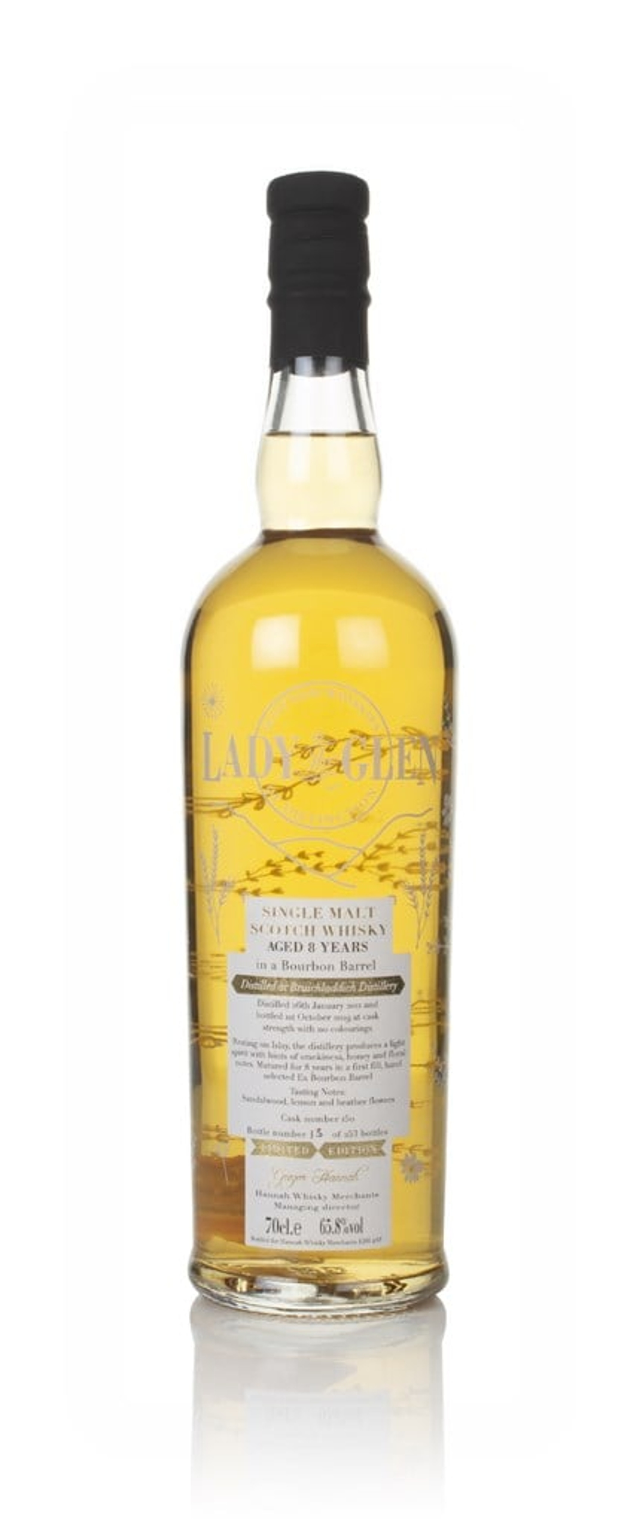 This Islay single malt hails from Bruichladdich, distilled on 26 January 2011. It was filled into a single bourbon barrel where it was left to mature for the next eight years. When 1 October 2019 came around, Hannah Whisky Merchants bottled it at cask strength, a generous 65.8% ABV, for the Lady of the Glen series.