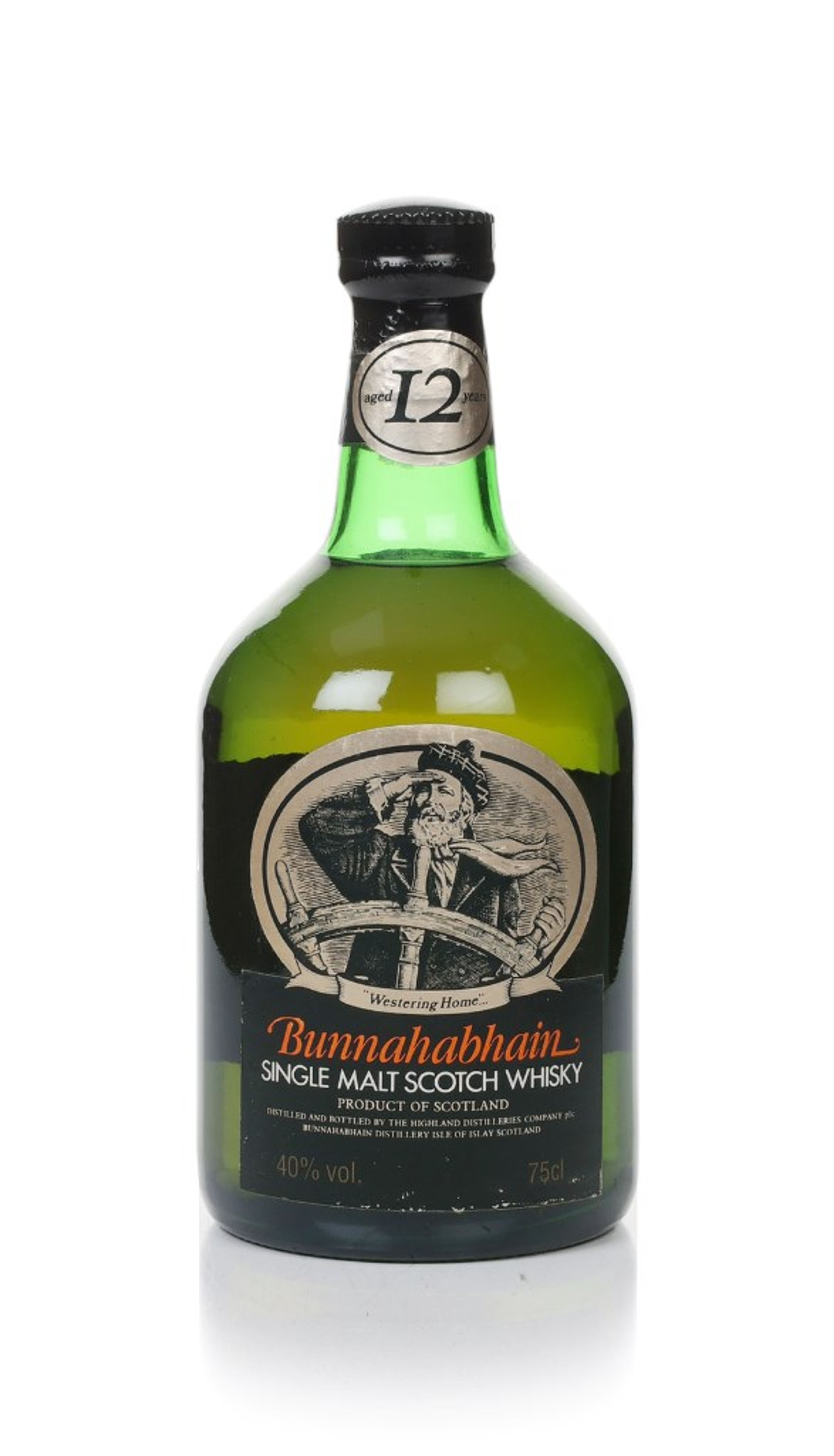 Aye aye captain, it's a bottle of Bunnahabhain single malt from the 1980s! Matured for 12 years, it was filled into a splendid green bottle with a label depicting a hearty Islay seafarer, who looks just about ready to find shore and pour himself a nice dram.