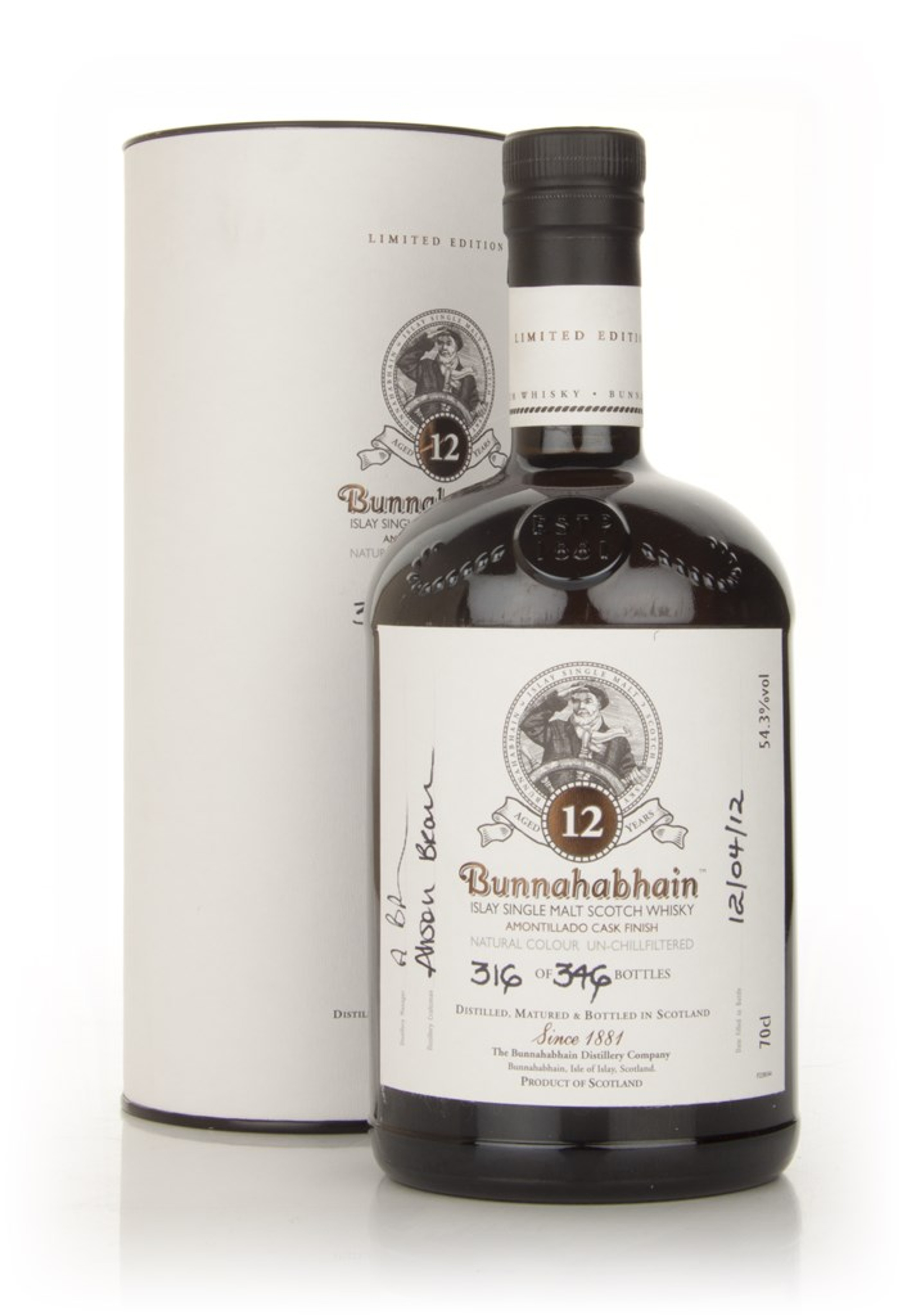 A superb and very rare 12 year old Bunnahabhain at natural cask strength, matured in an Amontillado sherry cask. This was bottled especially for the 2012 Feis Ile (Islay Festival) and there are just 346 bottles!