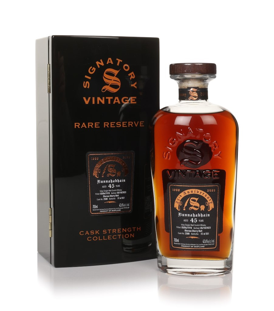 This superbly old single malt from Bunnahabhain joins a rather special installment of Signatory's Cask Strength Collection Rare Reserve, released to celebrate the indie bottler's 35th anniversary! Distilled in 1978, the whisky spent 45 years maturing, with a total of 351 bottles drawn from an oloroso sherry butt in 2023.