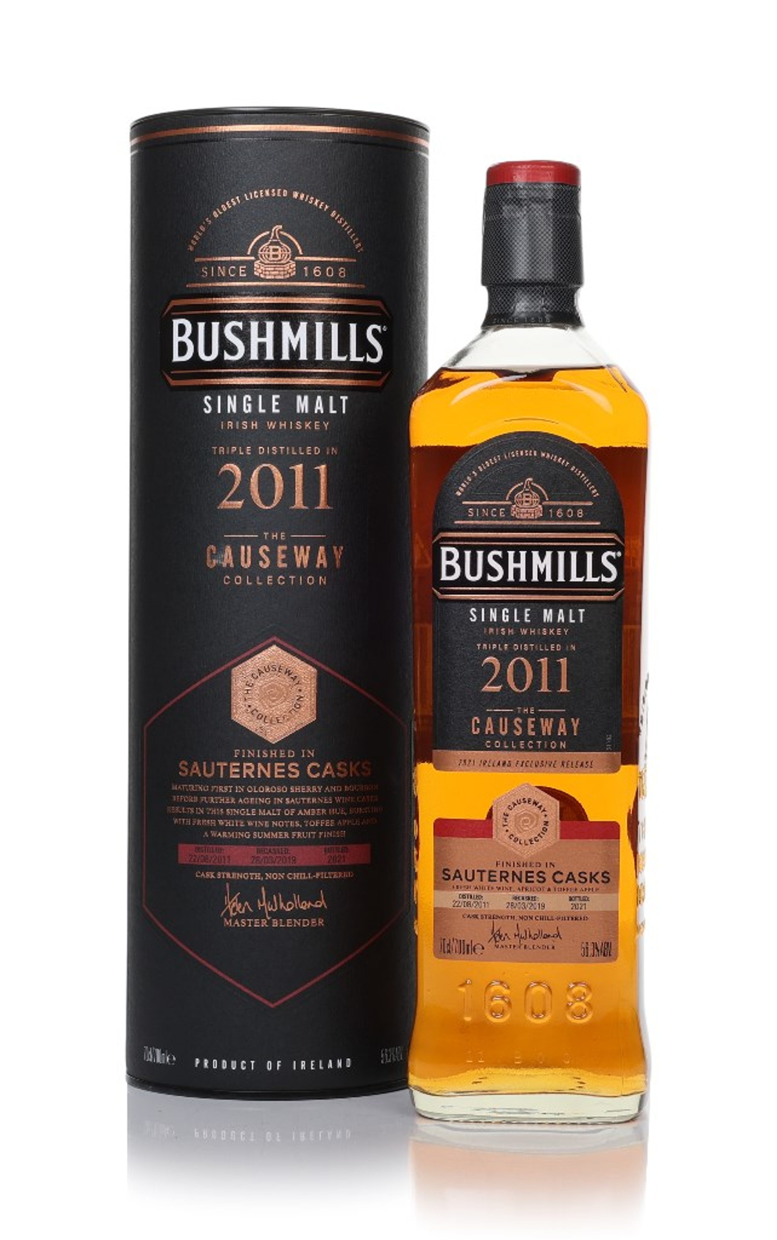 The Bushmills Causeway Collection sees master blender Alex Thomas curate a superb selection of well aged expressions in an intriguing range of maturations and finishes. This edition was distilled in 2011 and aged in a mixture of bourbon and oloroso sherry casks. Then it spent two years in barrels that previously held Sauternes, the sweet wine of Bordeaux, imparting a layer of pineapple, peach, and honey to the classic Bushmills profile. It's bottled at cask strength, 56.3% ABV.
