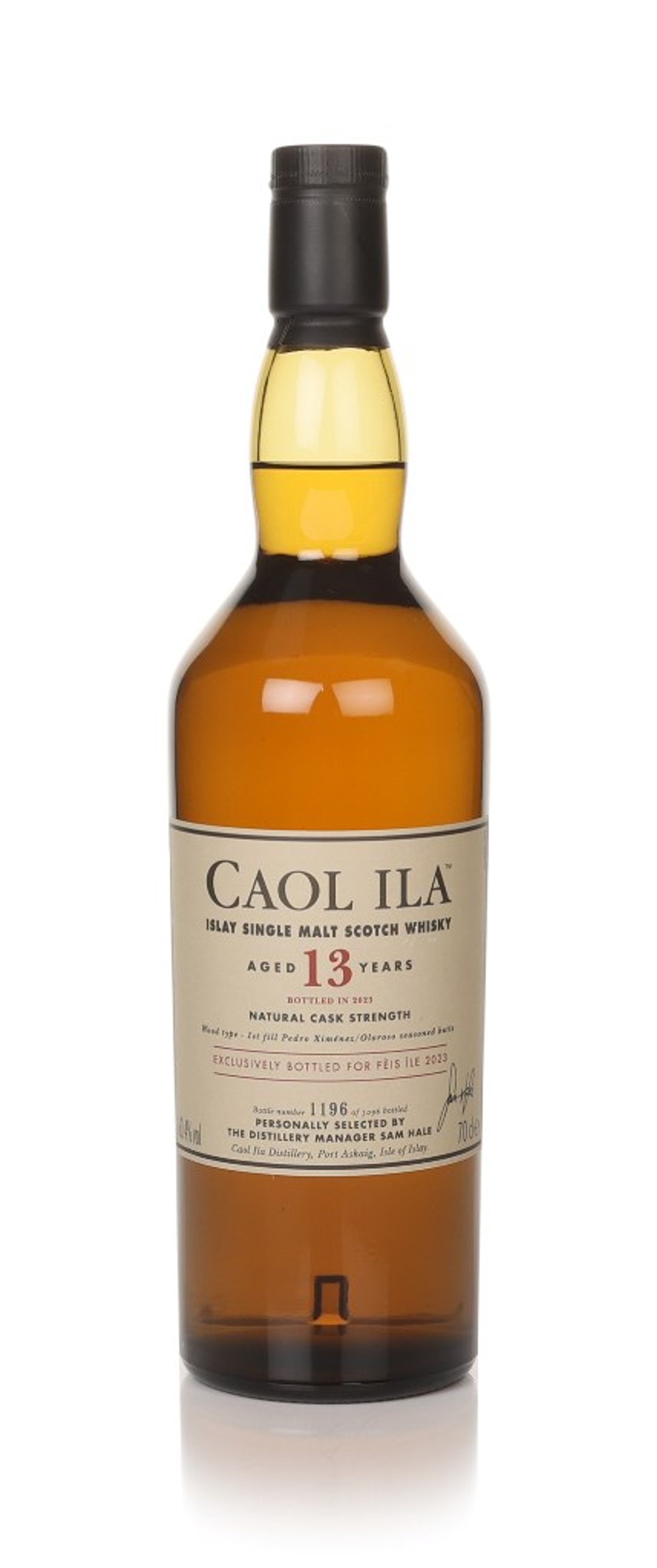 Caol Ila's Fèis Ìle 2023 release is a 13-year-old single malt, matured in a combo of first fill Pedro Ximénez and oloroso seasoned sherry butts. Bottled at cask strength in 2023, a release of 3,096 bottles.