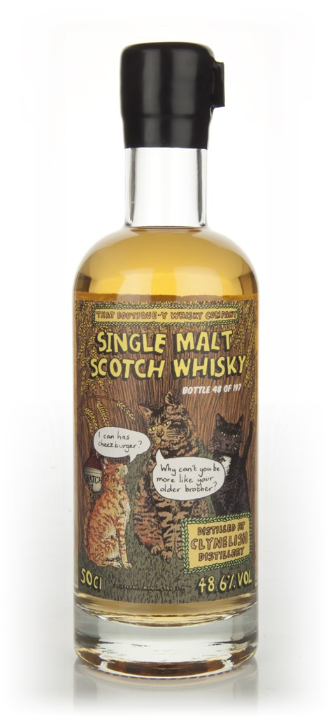 The label depicts a trio of cats, inspired by the grammatically inept felines of the internet. In this instance, a mother cat is scolding a ginger tom (Clynelish), telling him she'd prefer him to be more like his older brother (Brora). This is a reference to the fact that, in the whisky world, Clynelish is often (unfairly) made to play second fiddle to the now-silent, nearby distillery Brora...