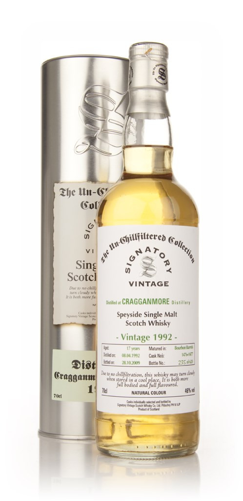 A release of just 620 bottles from Signatory's unchillfiltered range. This was distilled at Cragganmore on the 8th April 1992 and matured in bourbon barrels 1476 and 1477 for 17 years before bottling on the 28th October 2009.