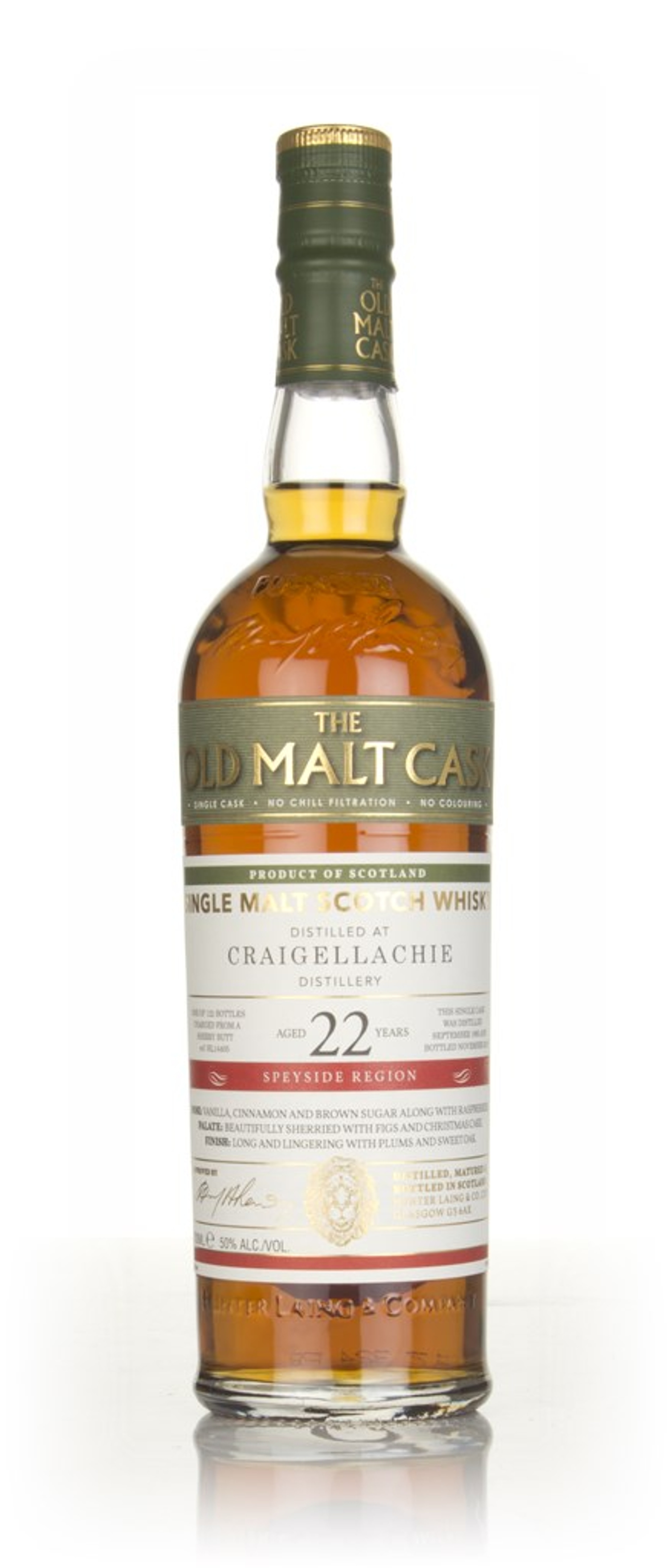 Sherried single malt from the Craigellachie distillery, independently bottled by Hunter Laing as part of the Old Malt Cask range. It was distilled in September 1995 and left to age in a sherry butt for 22 years, before being bottled in November 2017. A very small bottling outturn - only 122 of these were produced!