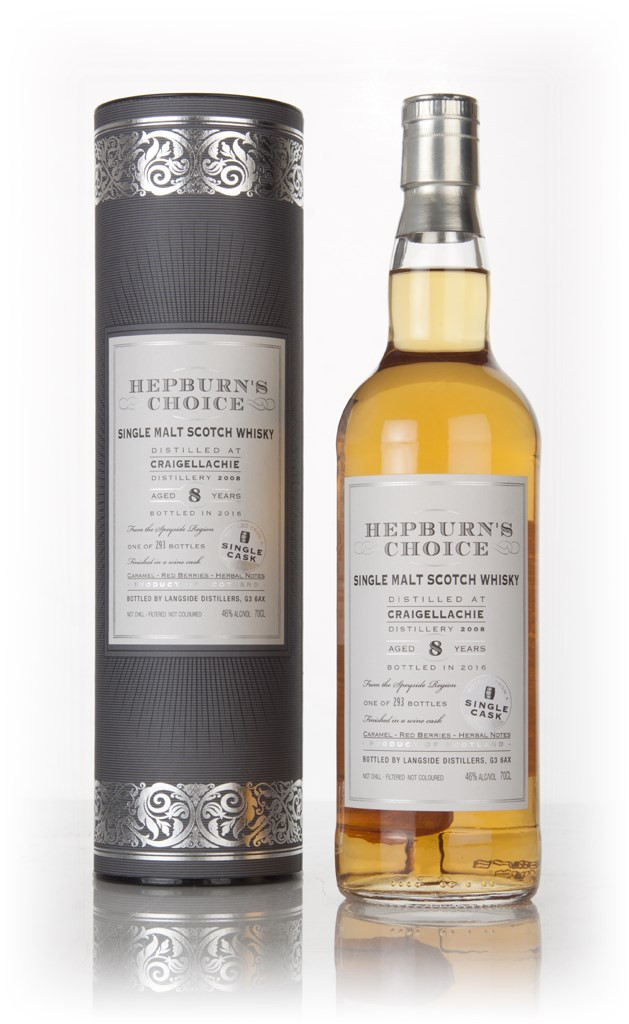 8 year old Craigellachie single malt finished in a wine cask and bottled by Langside for the Hepburn's Choice range. This was distilled in 2008 and bottled 8 years later in 2016 with an outturn of 293 bottles produced.