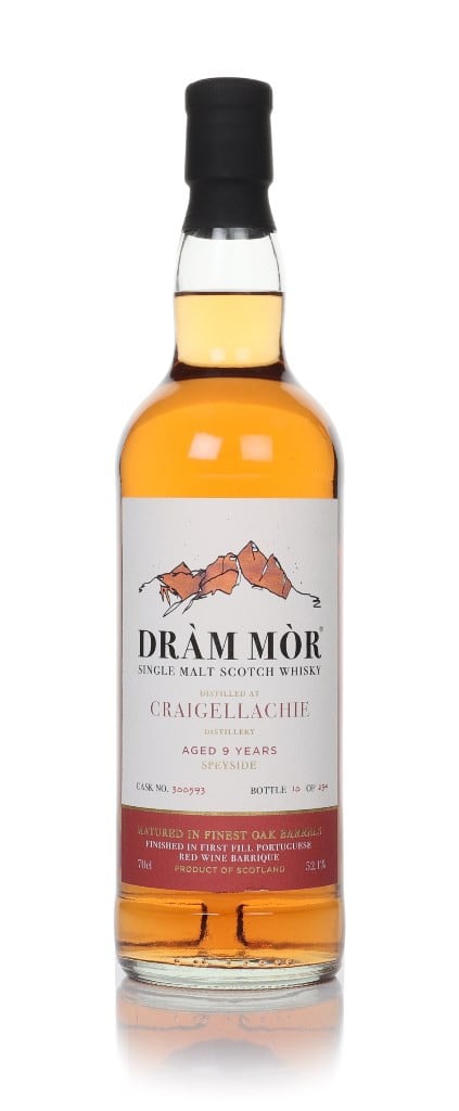 Superb Speyside single malt from Craigellachie, matured for nine years, including a finishing period in a single red wine barrique. The cask was opened by indie bottler Dràm Mòr, releasing a total outturn of 234 bottles.
