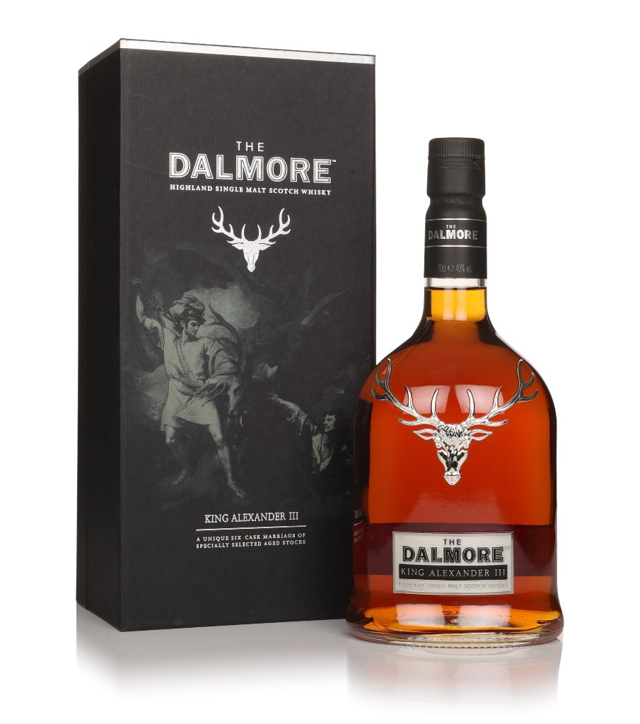 An old bottle and packaging of Dalmore King Alexander III, perfect for fans of the famous single malt. The Scotch whisky was aged in wine, Madeira, sherry, Marsala, Kentucky bourbon and Port casks.