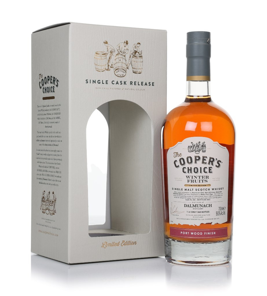 A limited edition single cask single malt distilled at Dalmunach. This Speysider initially matured in an American oak cask, before being finished in a ruby Port pipe. It was bottled in 2022 by The Vintage Malt Whisky Co. for The Cooper's Choice Winter Fruits Series, non-chill filtered and with natural colour, only 360 bottles were produced.