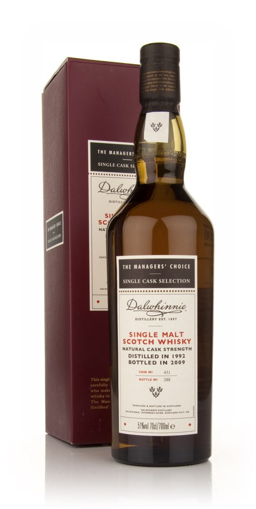 A single cask bottling from the Highland distillery Dalwhinnie, this was distilled in 1992 and matured in single cask number 431 before bottling in 2009 as part of the Manager's Choice range from Diageo.