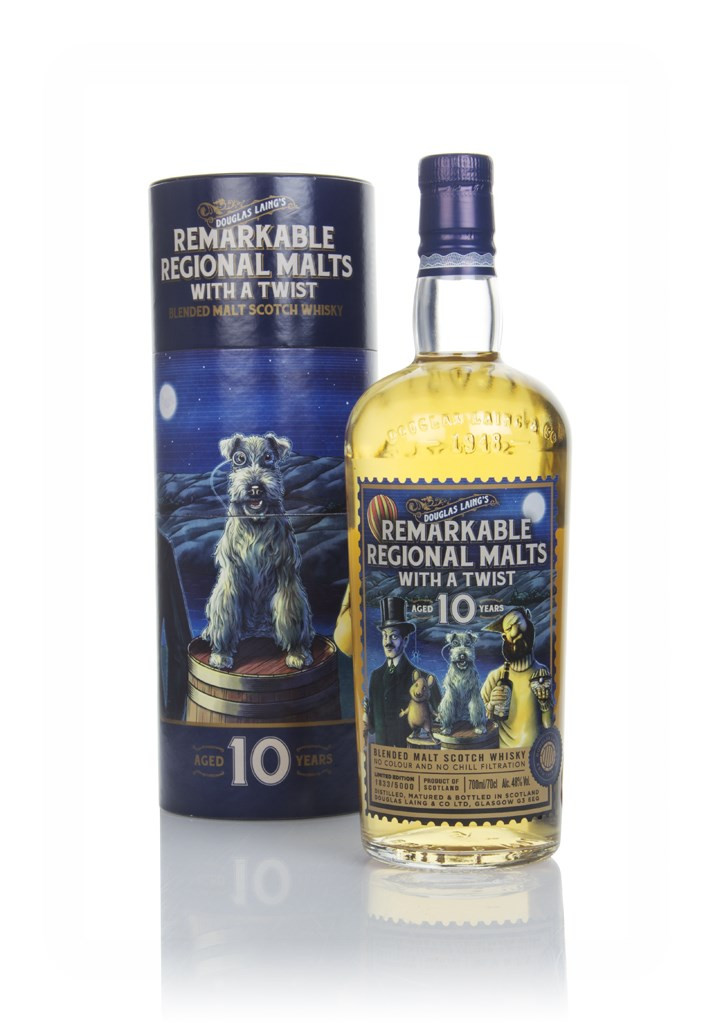 A 10 year old blended malt made from whiskies produced across all of Scotland whisky-making regions, created by Douglas Laing in celebration of the indie bottler's 70th anniversary. A tasty dram, with a very cool presentation - the label features the characters from Douglas Laing's Remarkable Regional Malts (including Big Peat, the Scallywag, the Timorous Beastie (whom is apparently a terrifyingly giant mouse), the Epicurean, the Rock Oyster and the spider from the Gauldrons), and part of the tube it comes in twists so you can make them swap heads!