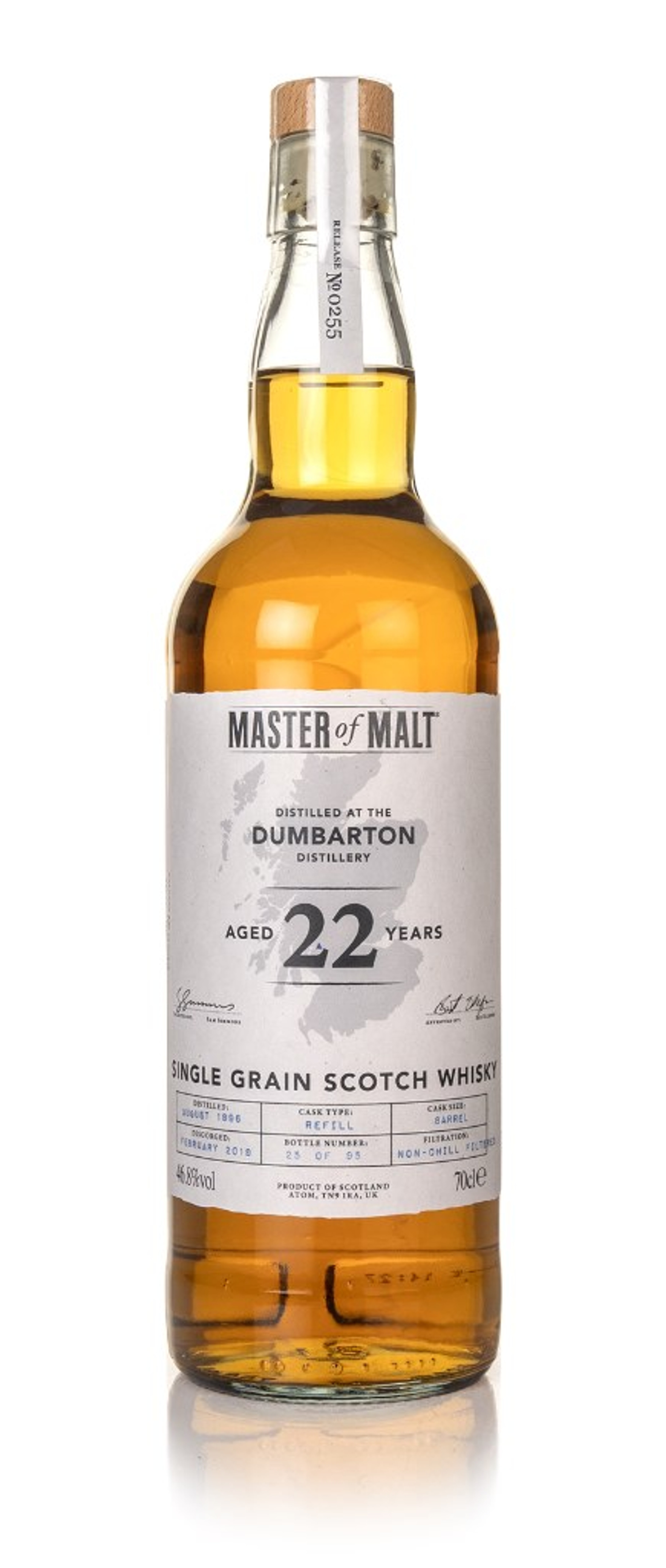 The Lowland-based Dumbarton distillery was founded in 1936 by legendary distiller Hiram Walker to produce grain whisky reserves for Ballantine's blended whisky. The distillery was famously home to a gaggle of around 100 Chinese white geese, introduced by Walker to protect it from intruders, it became known as the 'Scotch Watch'! Sadly, Dumbarton closed for good in 2002, but its legacy lives on in independent bottlings, like this one, and the remaining geese were retired, joining an existing flock at Glasgow Green. This 1996 vintage single grain Scotch, matured for 22 years in a refill barrel before joining our own exclusive Master of Malt collection. A release of 95 bottles.