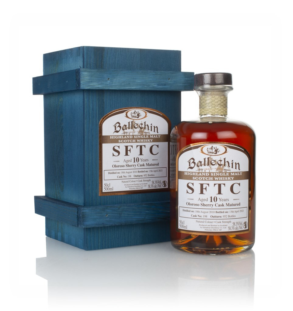 Smoky, sherried single malt from the Edradour Distillery, released under the Ballechin name (as is customary for peaty Edradour). This one was distilled in August 2010, and aged in an Oloroso sherry cask for 10 years, before eventually being bottled in April 2021 as part of the Straight From The Cask series. As such, it was bottled at cask strength, with no additional colours at all. 952 bottles were produced.