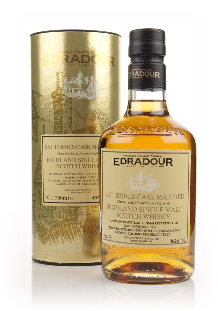 The third batch of Edradour single malt which has been fully matured in Sauternes wine casks. The Highlands whisky benefits from the sweet wine aromas and flavours that it acquired from the cask, adding a delectable depth to the expression. It was distilled in December 2003 and bottled in February 2013.