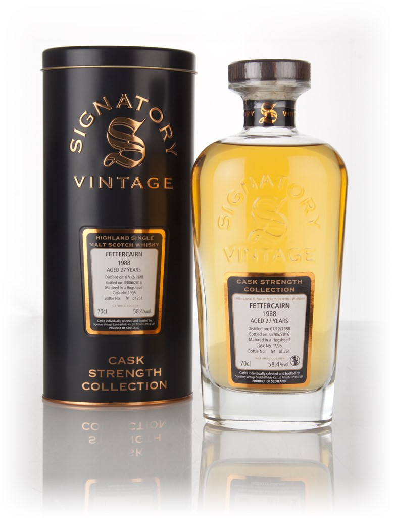 Fettercairn single malt aged for 27 years in one hogshead cask. This was distilled in December 1988 and set aside to mature until June 2016, when Signatory bottled it for their Cask Strength Collection. A release of 261 bottles.