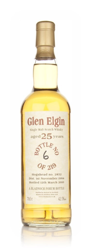 Single cask Glen Elgin, bottled for the Bladnoch Forum. This was distilled on the 1st November 1984 and matured for 25 years in hogshead number 2852 before bottling on the 12th March 2010. A release of 219 individually numbered bottles at cask strength.