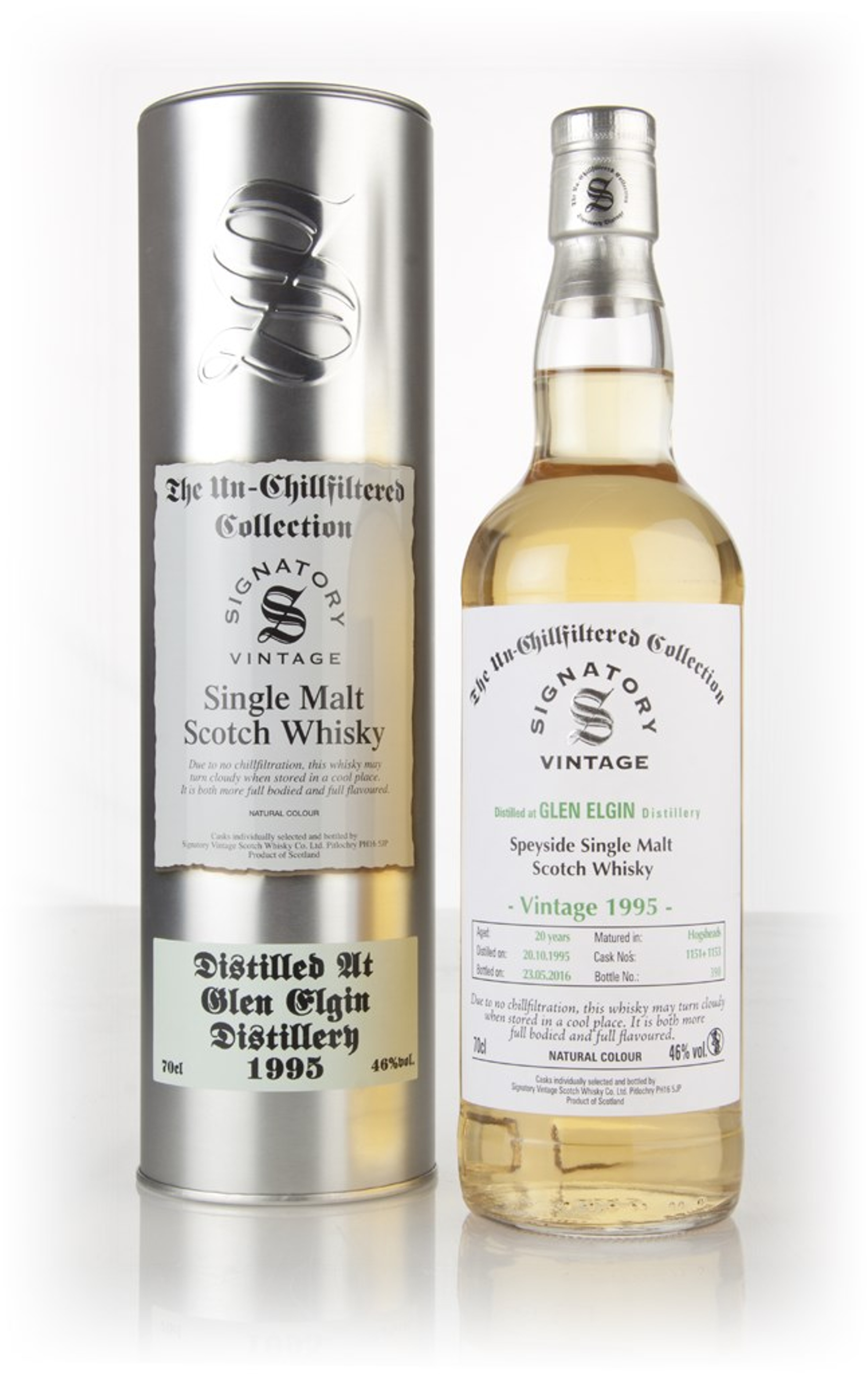 This is an independent bottling of 20 year old single malt Scotch whisky from the Glen Elgin distillery, drawn from a pair of hogshead casks which were filled in October 1995 and cracked open in May 2016. It was bottled by Signatory for their Un-Chillfiltered Collection.