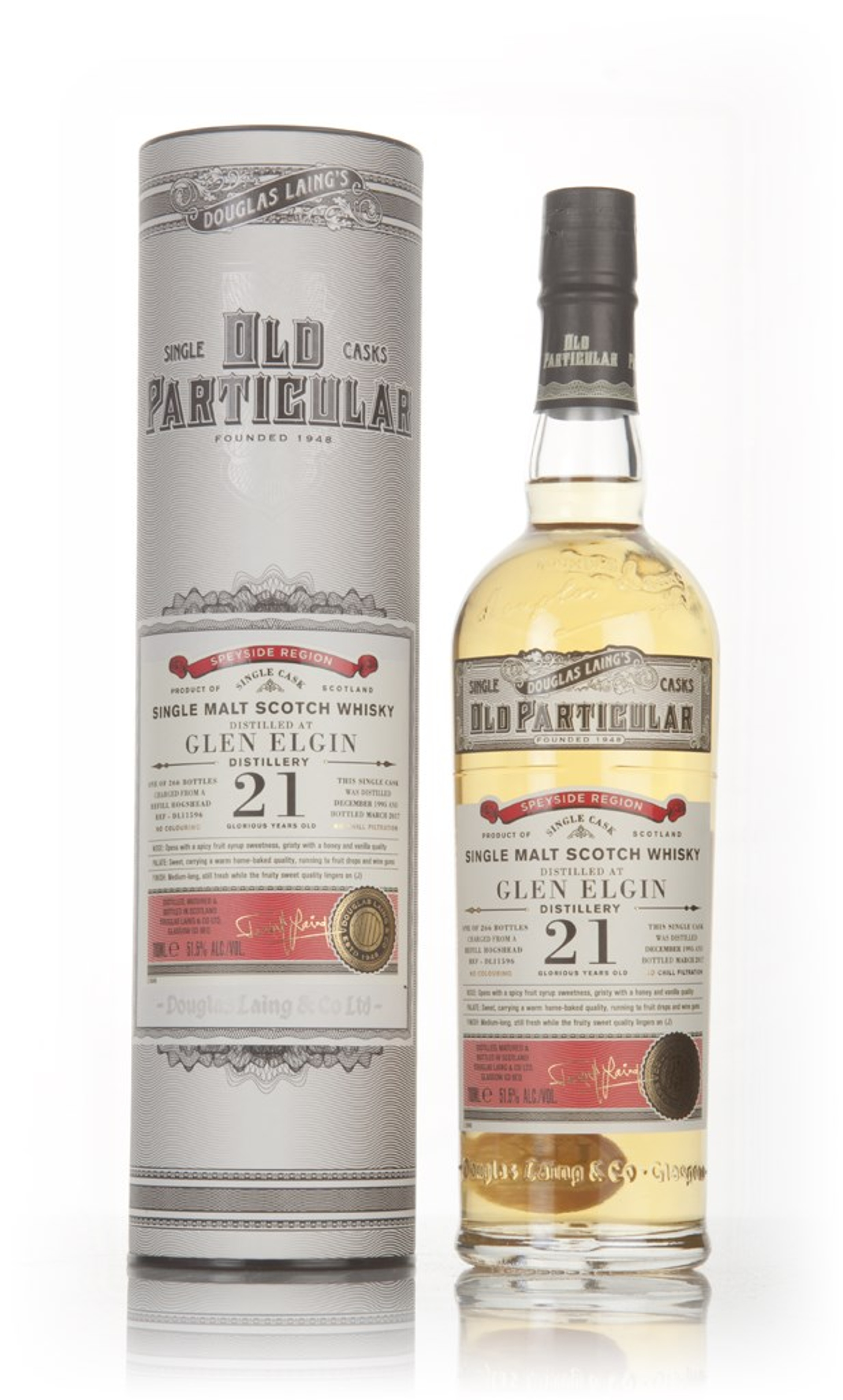 Independently bottled Glen Elgin single malt, aged in a refill hogshead for 21 years. It was distilled in December 1995 and left to rest in a refill hogshead until March 2017, when it was bottled by the chaps from Douglas Laing for their Old Particular range. 266 bottles were produced.
