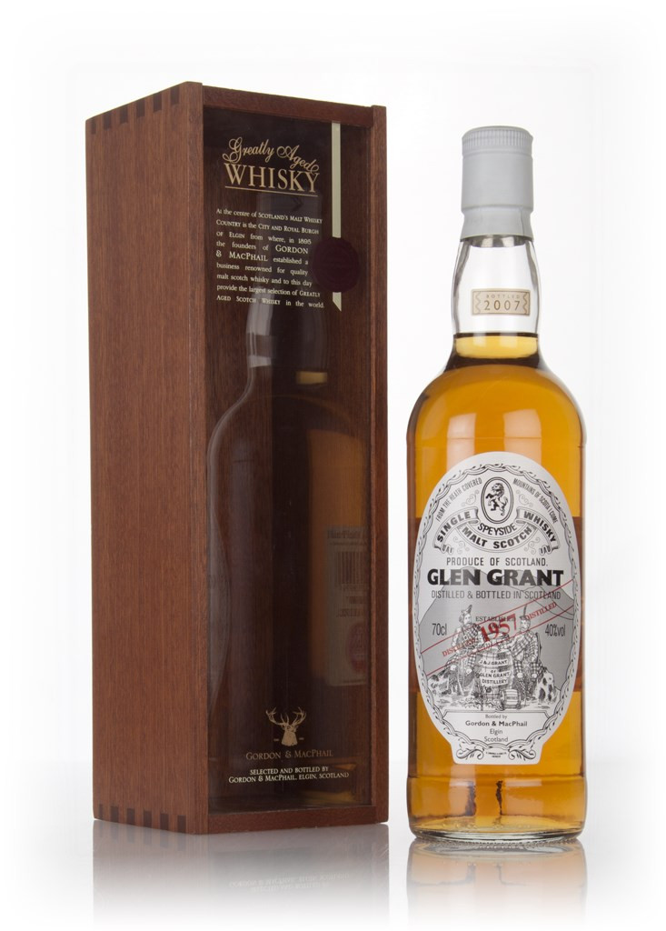 This is a 1957 vintage single malt from the magnificent Glen Grant distillery in the Speyside region. It was independently bottled by Gordon & MacPhail in 2007 and presented with a handsomely retro label.