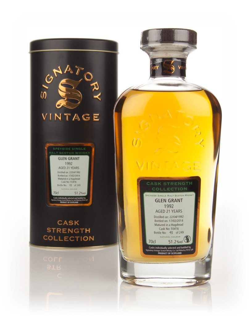Cask strength Glen Grant, yum yum yum! It was distilled by the distillery in Speyside in April 1992 and bottled in February 2014. 21 years in a hogshead has done this whisky good, it seems. It was bottled by Signatory with an outturn of 249 bottles.