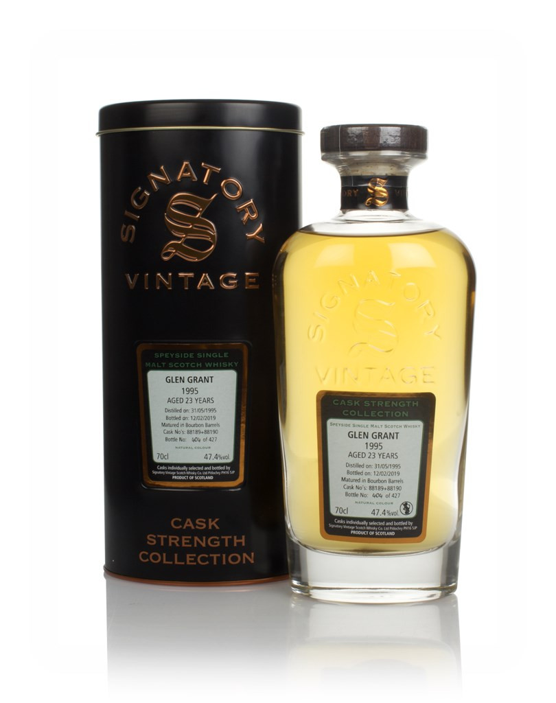 This bottle of Glen Grant has seen more than two decades of ageing after its distillation in May 1995. It matured nicely in a pair of bourbon barrels for 23 years, until the single malt was bottled in February 2019 for Signatory's Cask Strength Collection. The barrels saw an outturn of 448 bottles at 47.4% ABV.