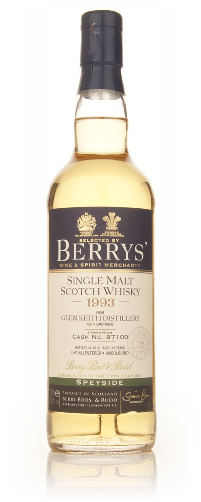 A Berry Bros. & Rudd independent bottling of Glen Keith distilled in 1993, before the distillery was mothballed in 1999. Lucky, this story has a happy ending as production started up again at Glen Keith in 2013. Cask 97100 matured this splendid single malt Scotch whisky from 18 years before it was bottled in 2012.