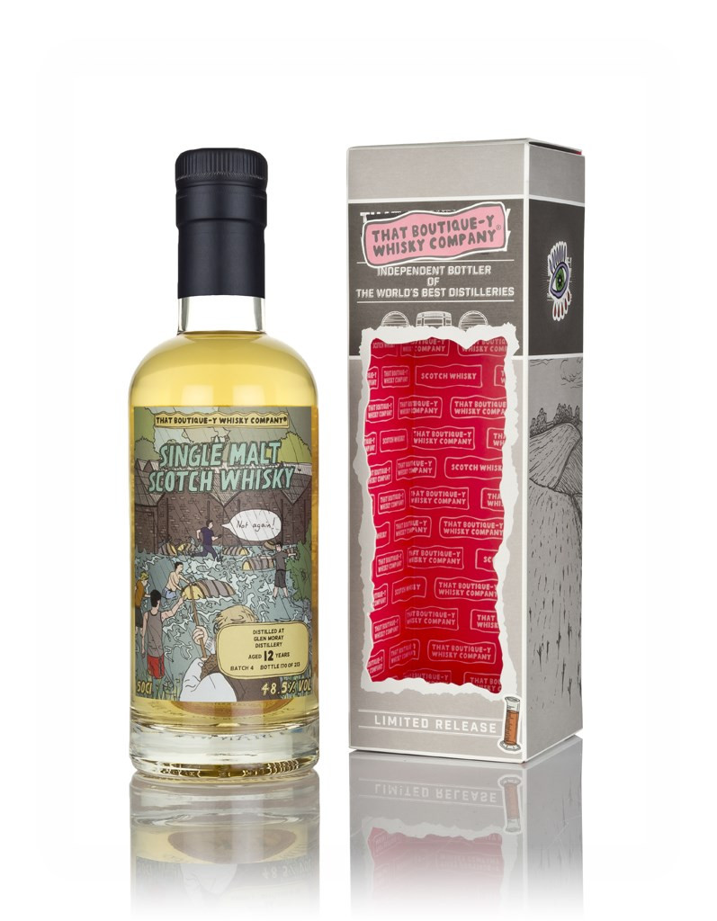 Glorious Glen Moray single malt here, bottled at 12 years of age by the folks from That Boutique-y Whisky Company. As you can see on the label, Mother Nature tried to get her hands on a few casks of Glen Moray back in 2002. The banks of the nearby River Lossie burst, causing a flood of water that threatened to whisk away casks of Glen Moray's whisky!