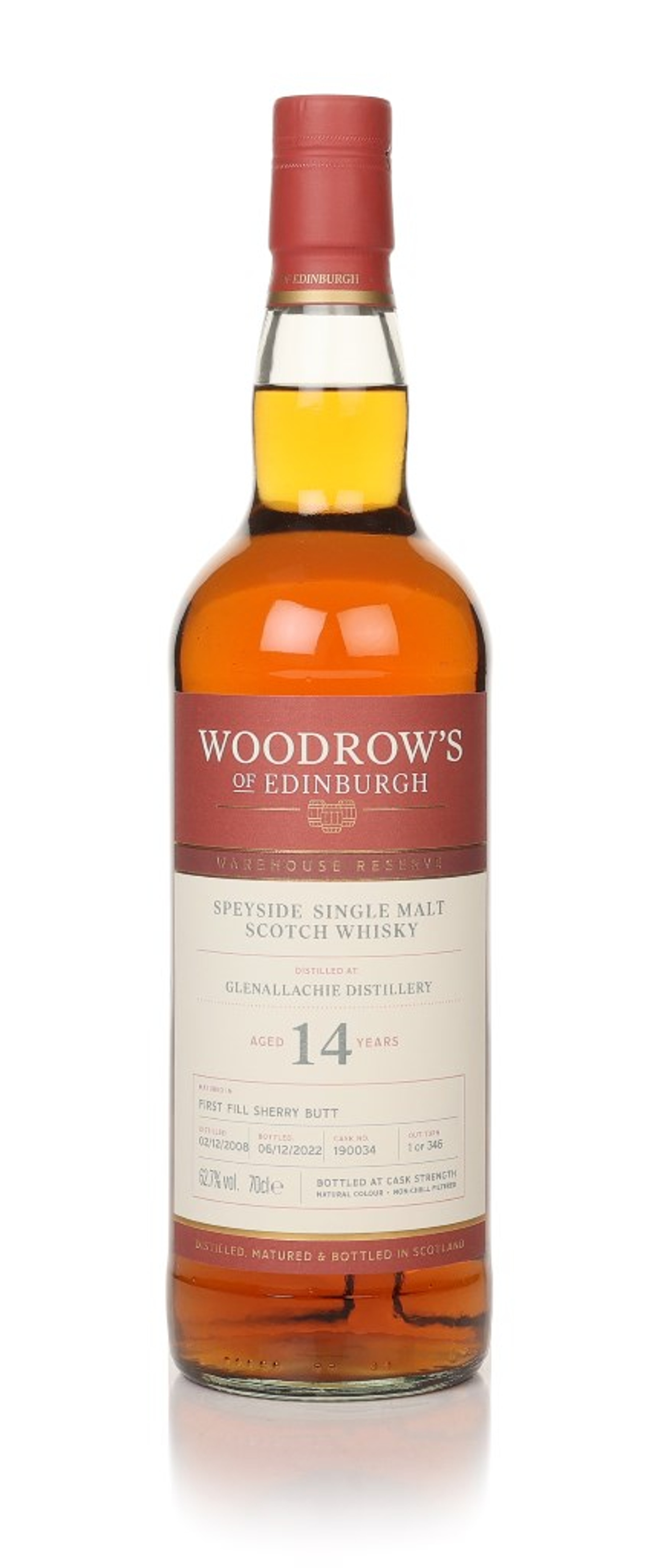 Distilled at GlenAllachie in 2008, this single malt spent 14 years maturing in a first-fill sherry butt. In 2022, the cask was opened by Woodrow's of Edinburgh, independently releasing a total of 346 cask-strength bottles, without added colour or chill filtration.