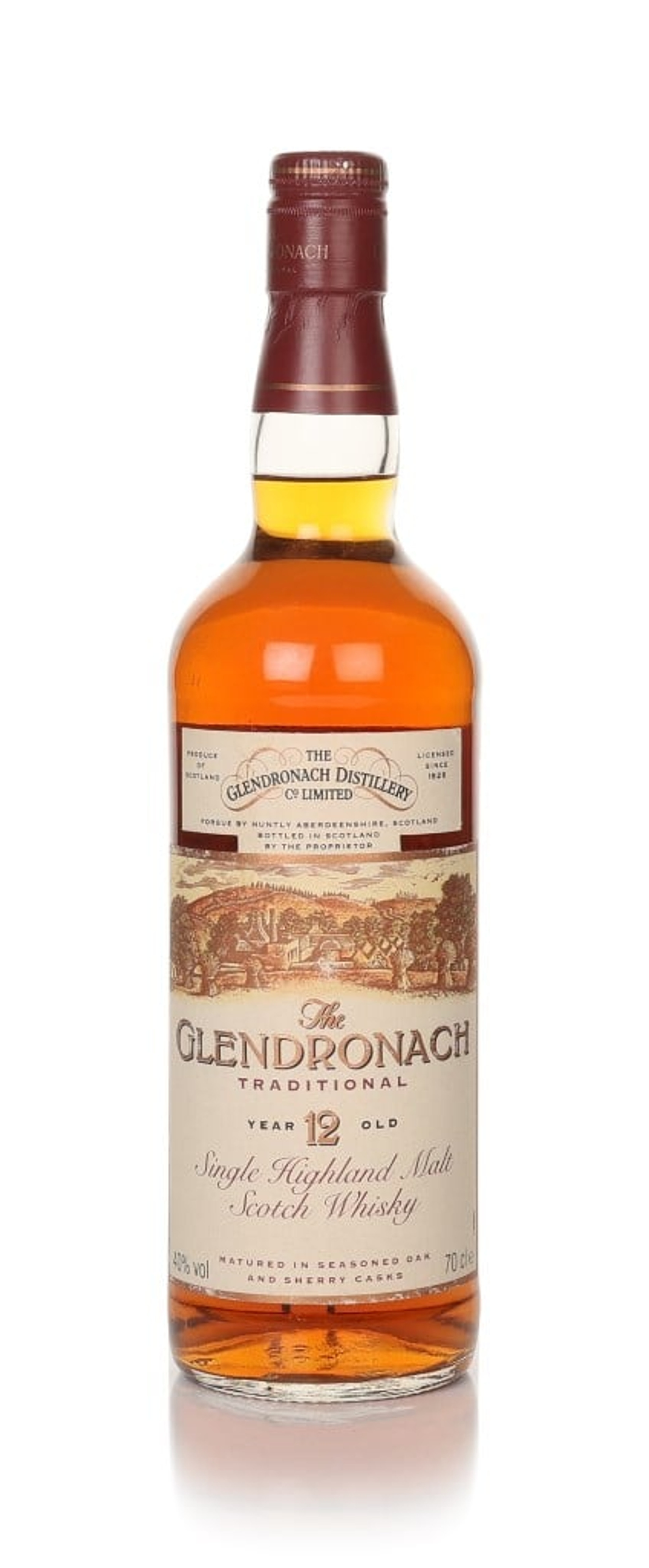 A charming old bottle of The GlenDronach 12 Year Old Traditional single malt, matured in a combo of seasoned oak and sherry casks, and originally released back in the 1990s.