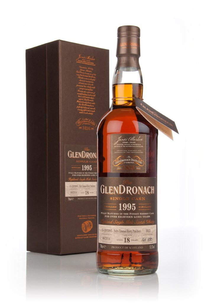 One of two 18 year old single malt Scotch whiskies from Batch 10 of the GlenDronach single cask bottlings. It was matured for its entirety in a Pedro Ximénez puncheon, from October 1995 to June 2014. 650 bottles were produced.