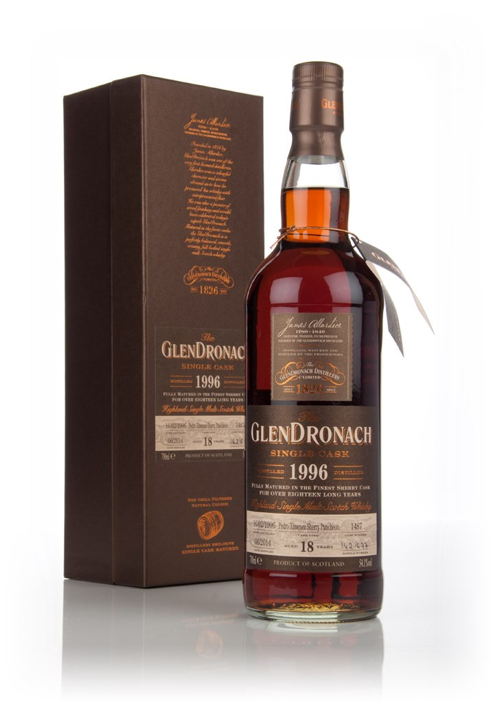 Another 18 year old single malt from the tenth batch of GlenDronach single cask bottlings, also matured in a Pedro Ximénez puncheon. This one was distilled in February 1996 and eventually bottled in June 2014 with an outturn of 677 bottled. Rich with black coffee, espresso and mocha notes - it's like a little coffee shop in a bottle.