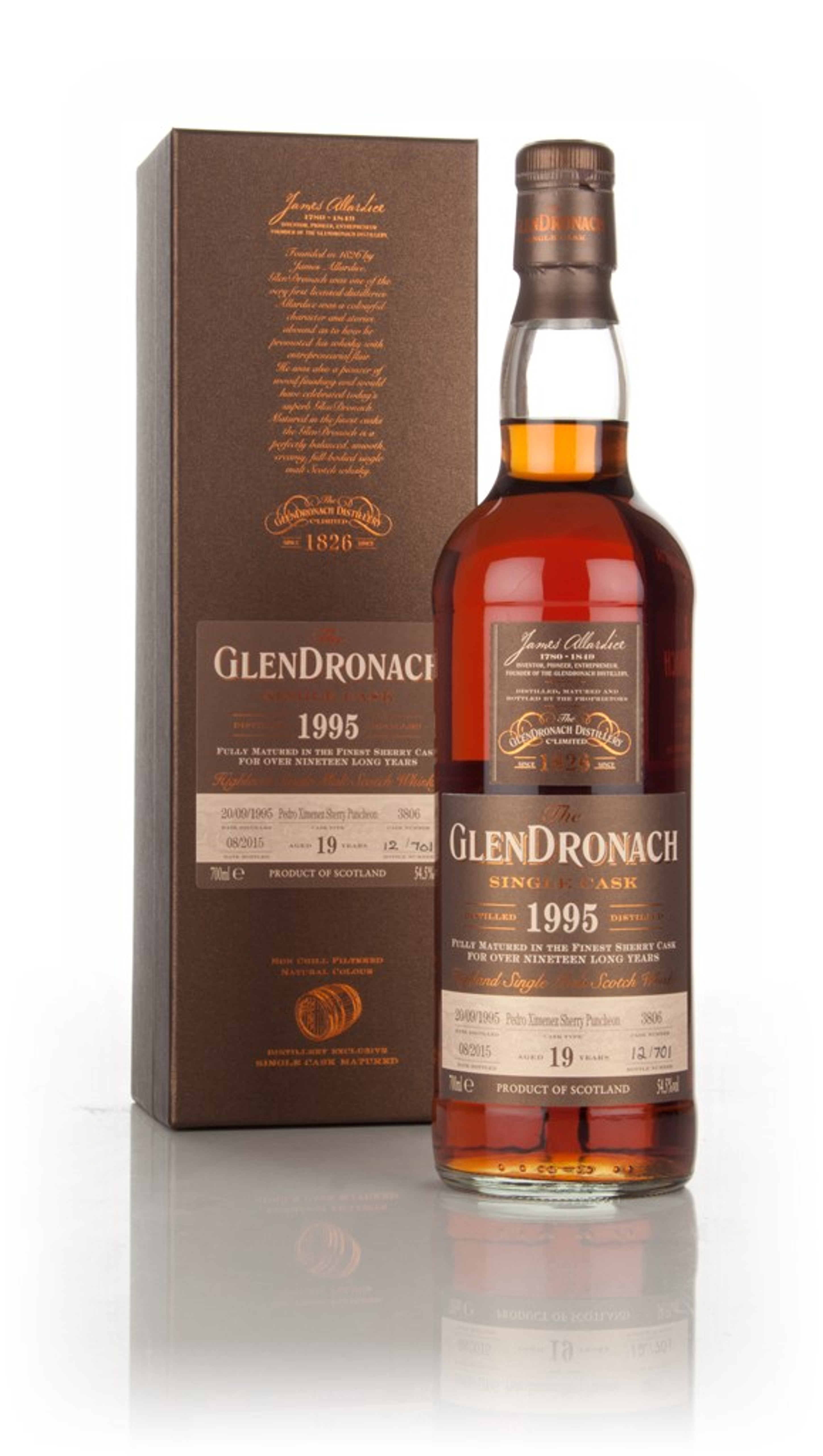 The 12 batch of GlenDronach's single casks have arrived! This one is a 19 year old single malt, matured in cask #3806 (a Pedro Ximénez Sherry puncheon) from September 1995 to August 2015, when it was bottled at 54.5% ABV. 701 bottles were produced.