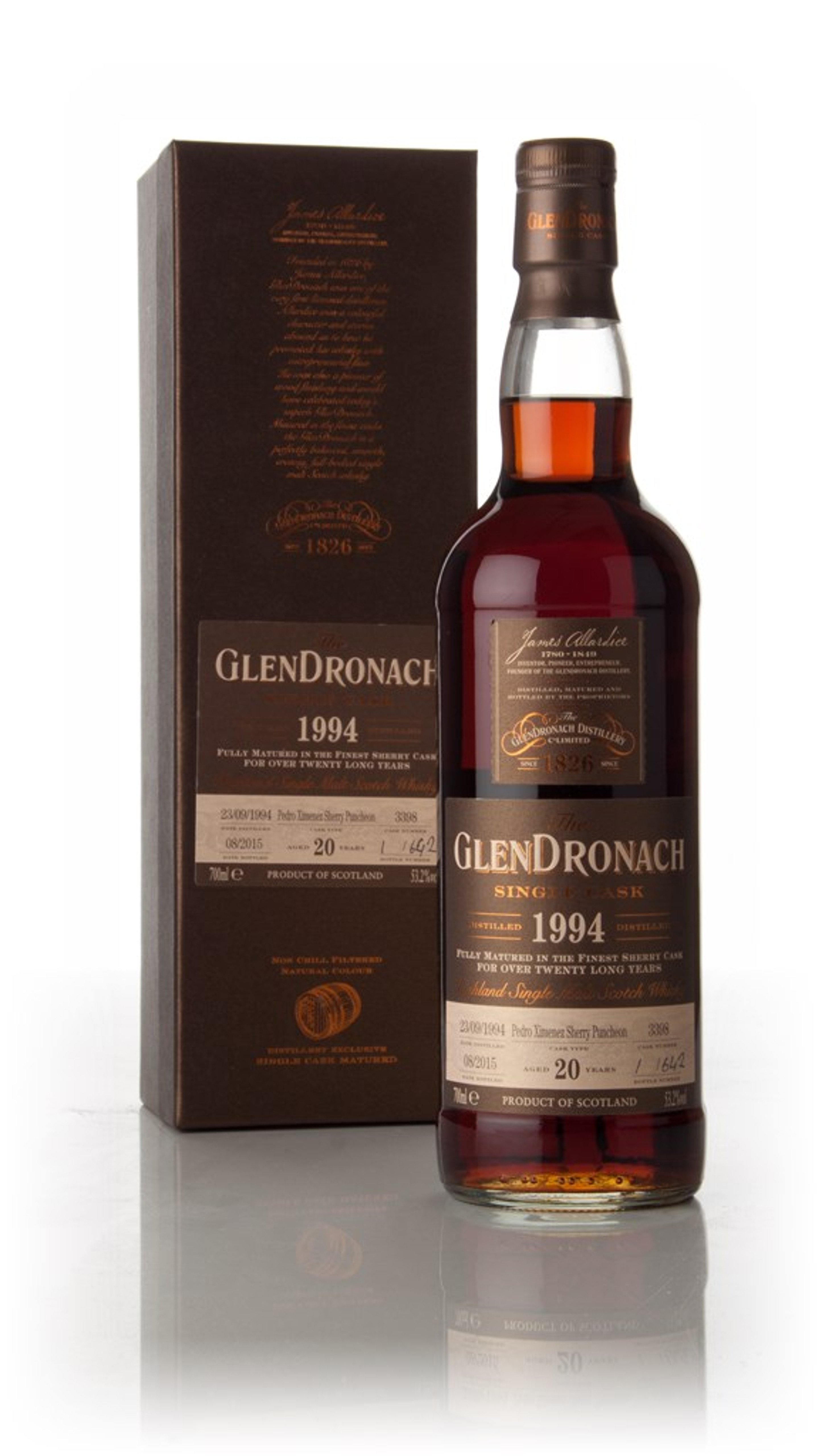 A 20 year old GlenDronach, matured in a single Pedro Ximénez Sherry puncheon from September 1994 to August 2015! This ought to be just bursting with delicious Sherried notes throughout... It has been released as part of GlenDronach's 12th batch of single cask releases, which are often highly anticipated (and simply fantastic). 642 bottles were produced.