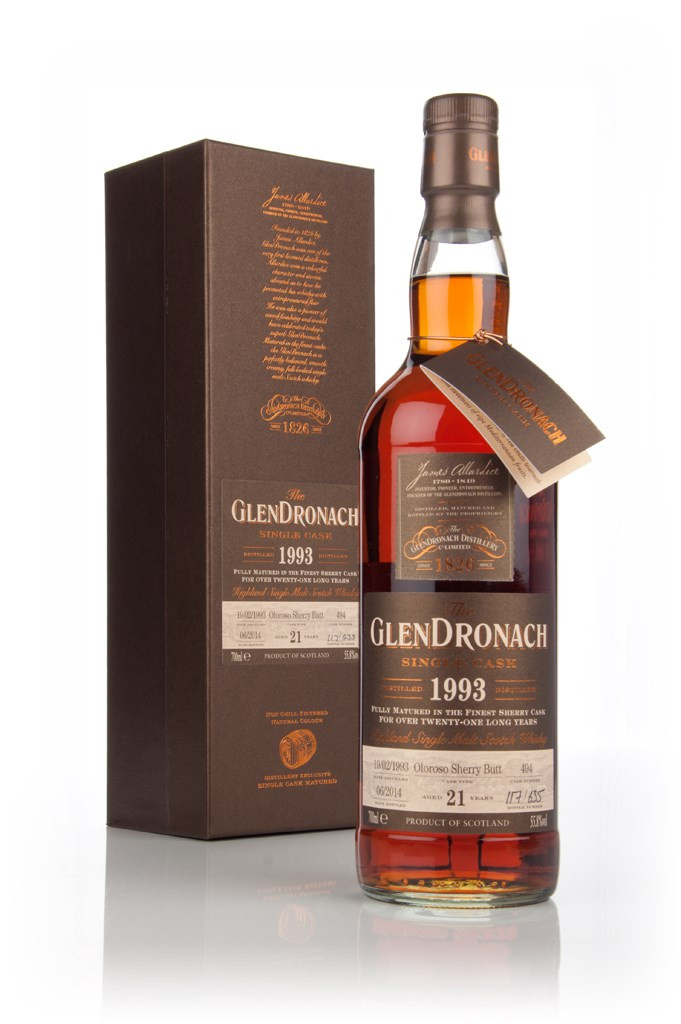 21 year old single malt Scotch whisky, matured in an Oloroso Sherry butt for Batch 10 of the GlenDronach single cask bottlings range. Well Sherried, tropical and just a little spicy with peppercorn sparks. It was distilled in February 1993 and bottled in June 2014 with an outturn of 635 bottles.