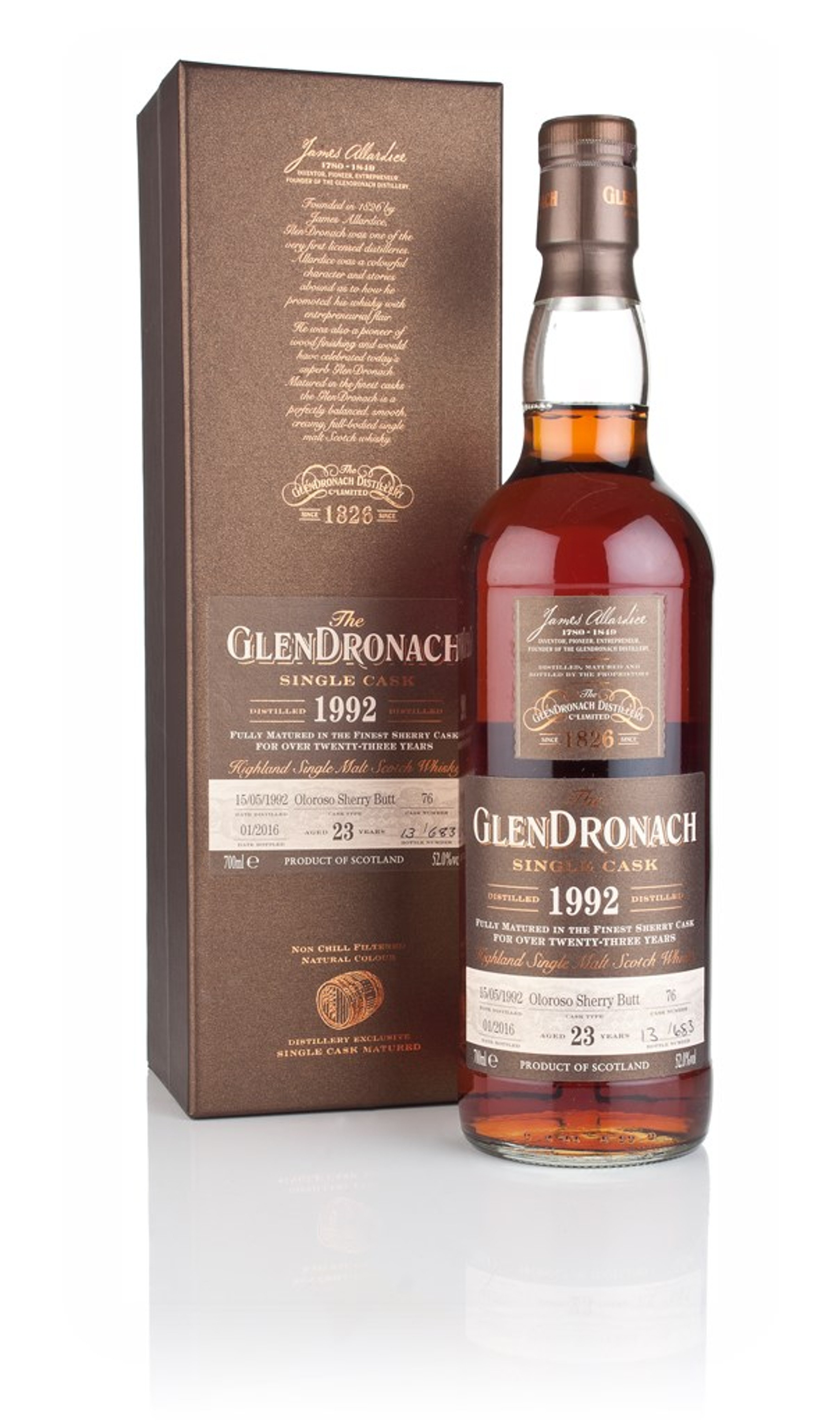 Single cask GlenDronach matured in an Oloroso Sherry Butt for 23 years from 15th May 1992 to January 2016! The outturn was 683 bottles. Popular these releases are, because they're all yummy.