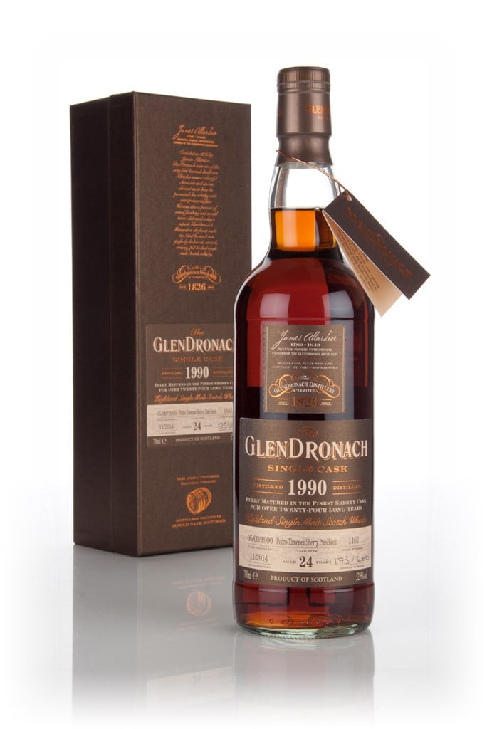 A 24 year old GlenDronach single malt Scotch whisky, distilled in September 1990, matured in a Pedro Ximénez Sherry puncheon and bottled in November 2014 as part of their 11th batch of single cask releases. A classic GlenDronach, this one. Ooodles of Sherried spice, Christmas cake and toasty oak, with touches of cigar box and fresh herbs giving depth and character. 660 bottles were produced.