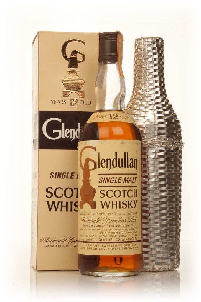This incredibly collectible bottle of Glendullan 12 Year Old from the 1960s comes with a fancy presentation box and, evidently, some sort of silver spaceship.