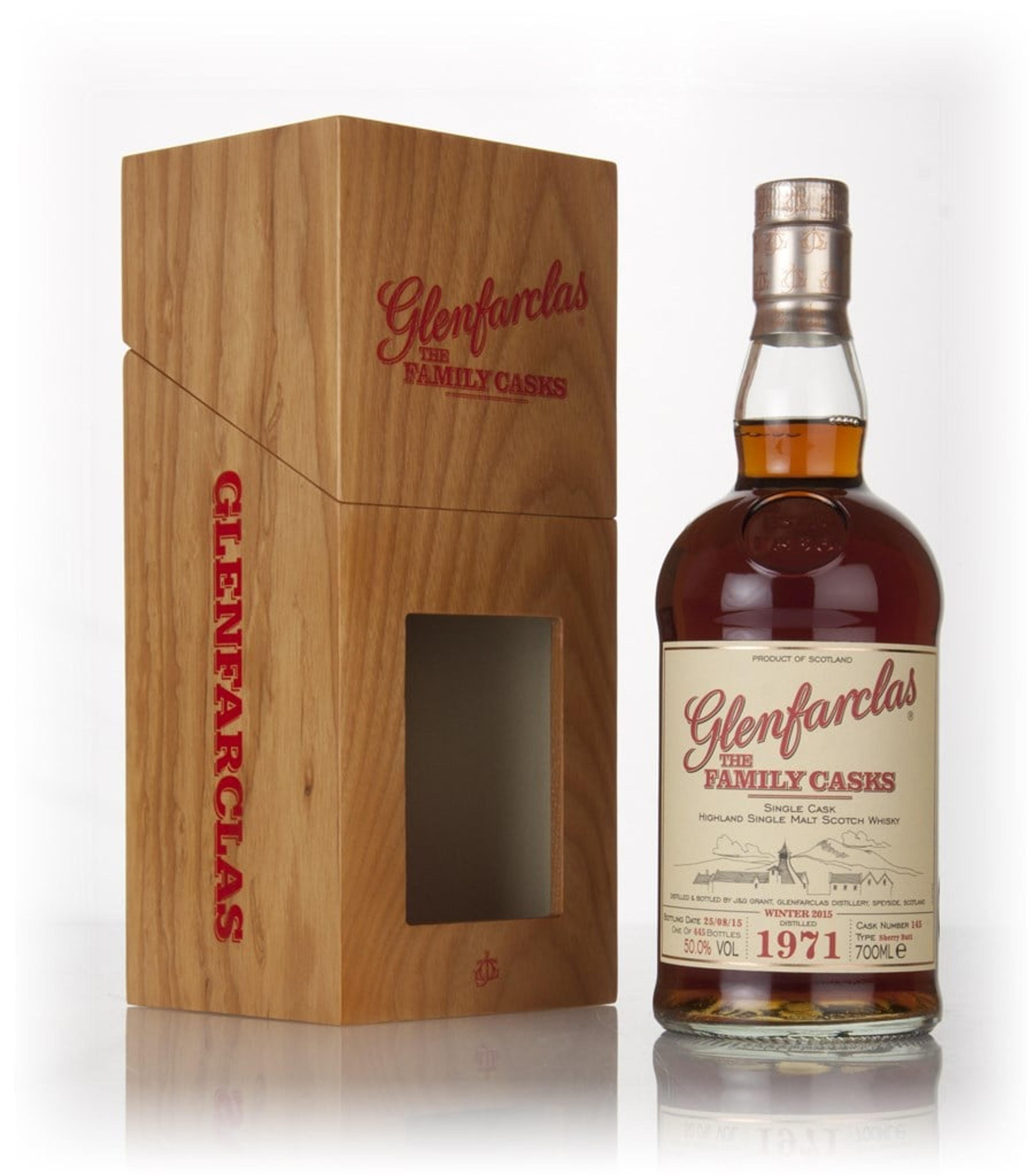 A Glenfarclas Family Cask bottling of 1971 vintage single malt Scotch whisky, matured in a single Sherry butt. This whisky stayed in the Sherry butt until August 2015, when the cask was cracked open and the whisky bottled at 50% ABV with an outturn of 445 bottles for the Winter 2015 Release.