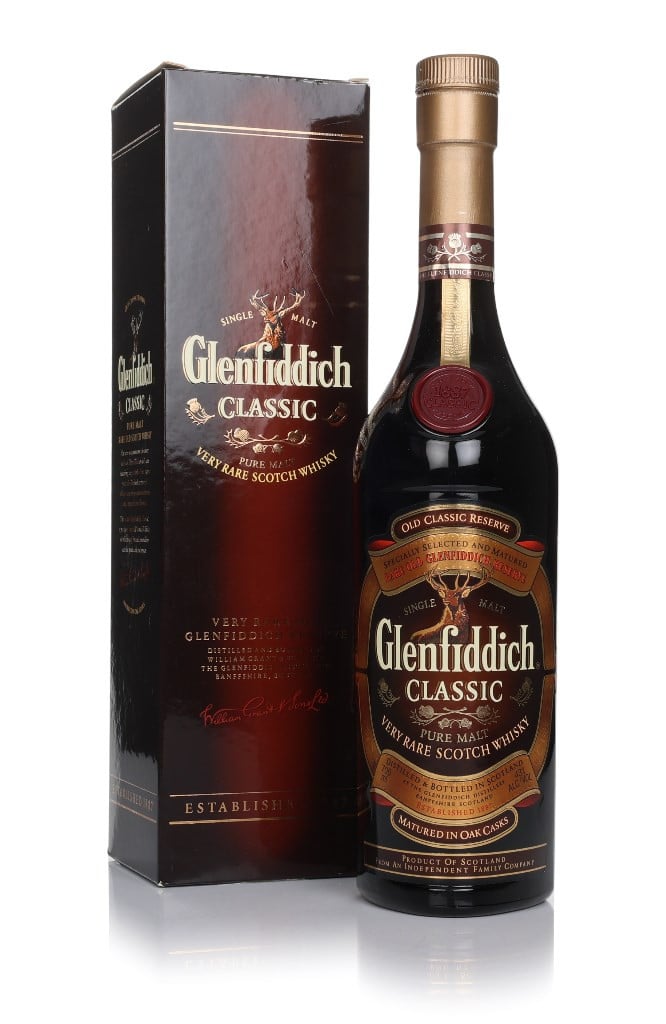 A 1990s bottling of Glenfiddich Classic. The now-discontinued single malt Scotch is a no-age-statement expression and should make an intriguing addition to a collection.