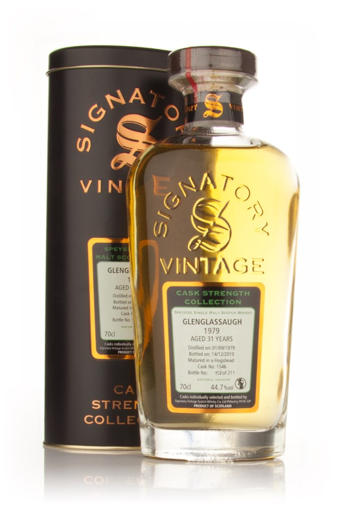 Aged for 31 years, this Glenglassaugh was distilled on the 1st September 1979, and matured in hogshead number 1545 before bottling by Signatory on the 2nd November 2010. (label on tin is slightly damaged, but otherwise in good condition). A release of 256 numbered bottles.