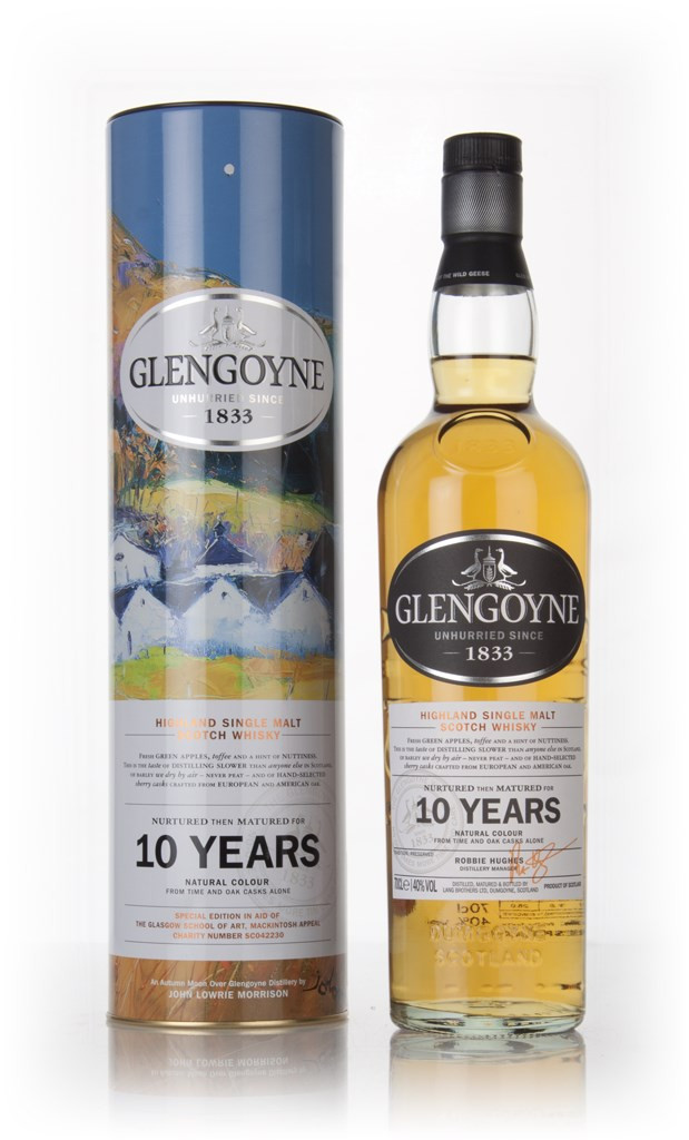 The first in a series of releases from Glengoyne made in collaboration with Scottish contemporary artist Jolomo to contribute to The Glasgow School of Art Mackintosh Campus Appeal, set up after a fire damaged the school in 2014. This bottle of Glengoyne 10 Year Old comes with a presentation tin featuring Jolomo's 'Autumn Moon Over Glengoyne' printed on it.