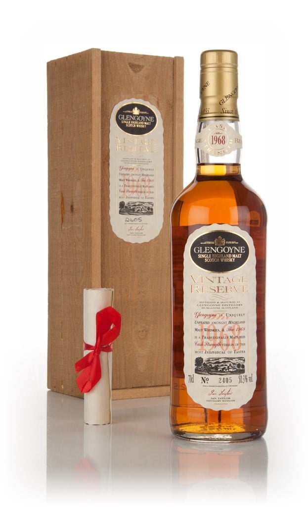 A collectible bottling of 1968 vintage Glengoyne Highland single malt Scotch whisky, released as part of their Vintage Reserve series. It was made with unpeated malt and distilled in 1968, before being matured for 25 years and bottled during the 1990s.