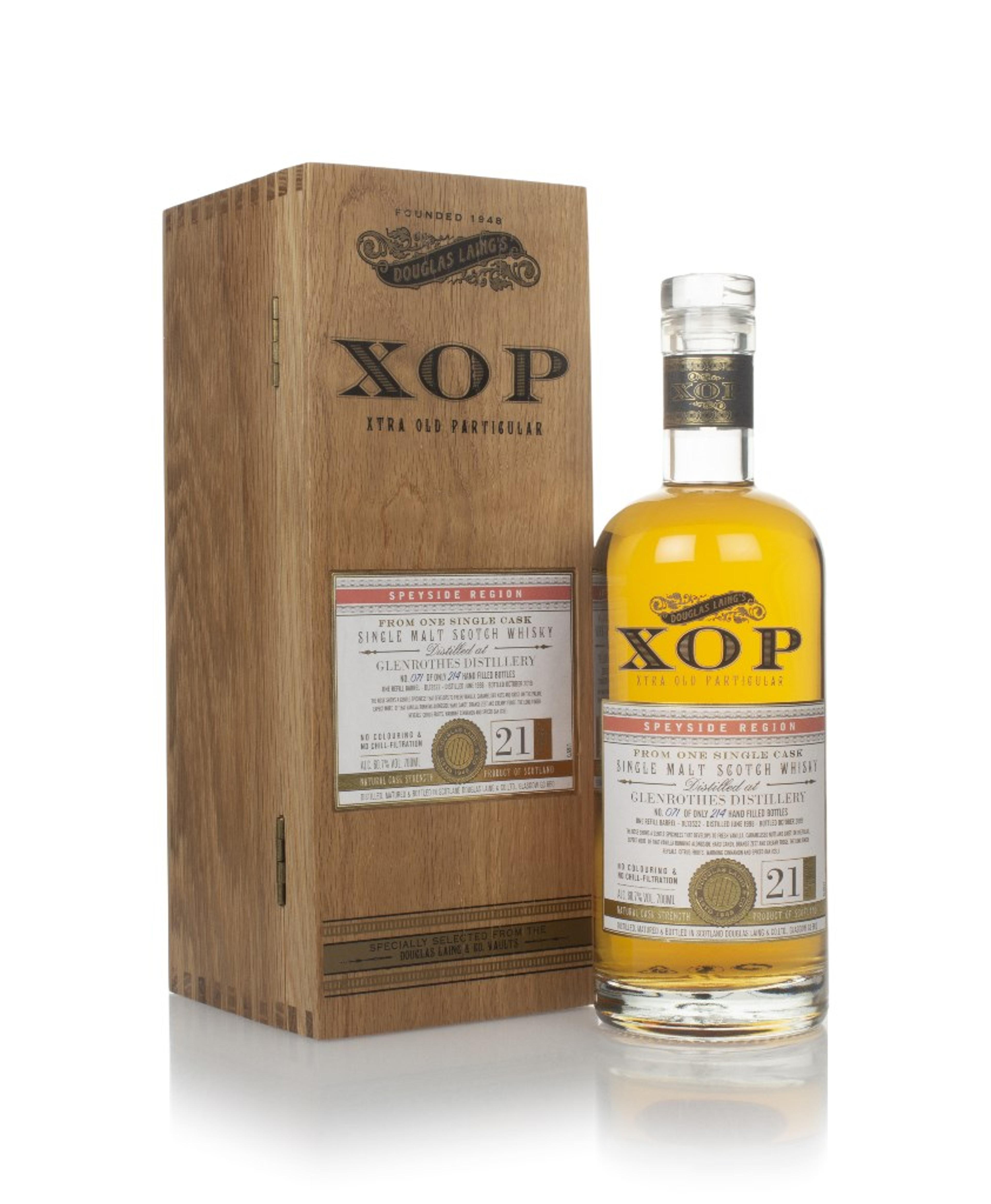 Well-aged, single cask Glenrothes from Douglas Laing! Distilled in 1998, it was left to mature in a refill barrel for over two decades. Eventually it was bottled at 21 years old in October 2019 at cask strength, with an outturn of 214 bottles at a burly 60.7% ABV for the Xtra Old Particular range.
