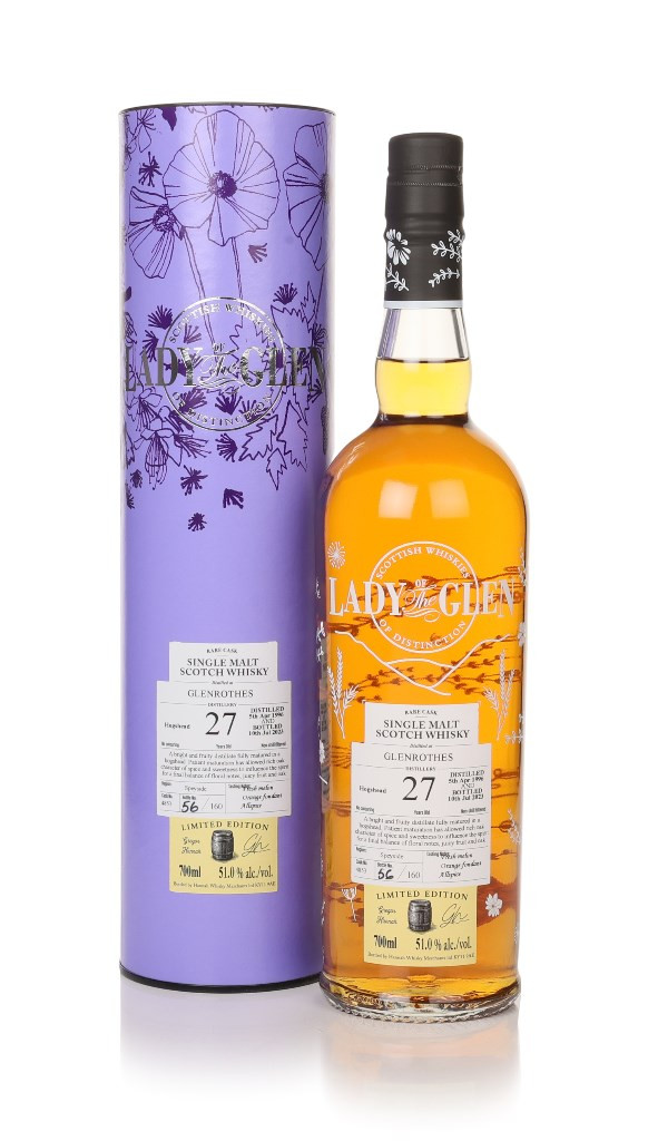 Here we have an impressive Glenrothes 27 Year Old 1996 vintage Speyside single malt Scotch whisky. It was matured in a single cask hogshead (#4853) and then bottled in July 2023 at 51% ABV by Hannah Whisky Merchants for the Lady of the Glen series. There's just 160 numbered bottles of this one.