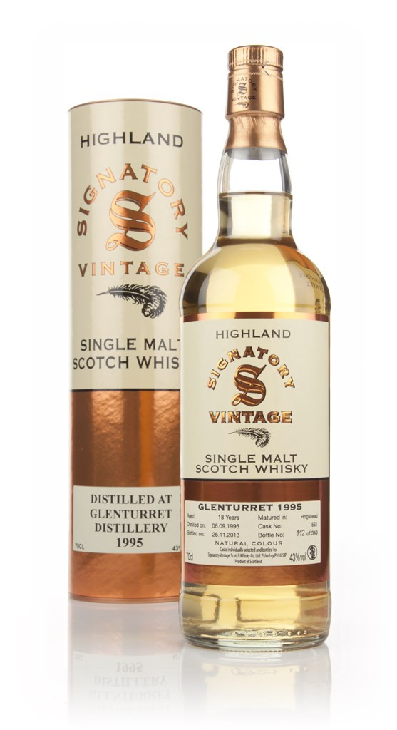 Signatory had the honours of bottling a single cask of Glenturret single malt Scotch whisky in November 2013. The whisky was distilled in September 1996 and matured for 17 years. 349 bottles were produced.