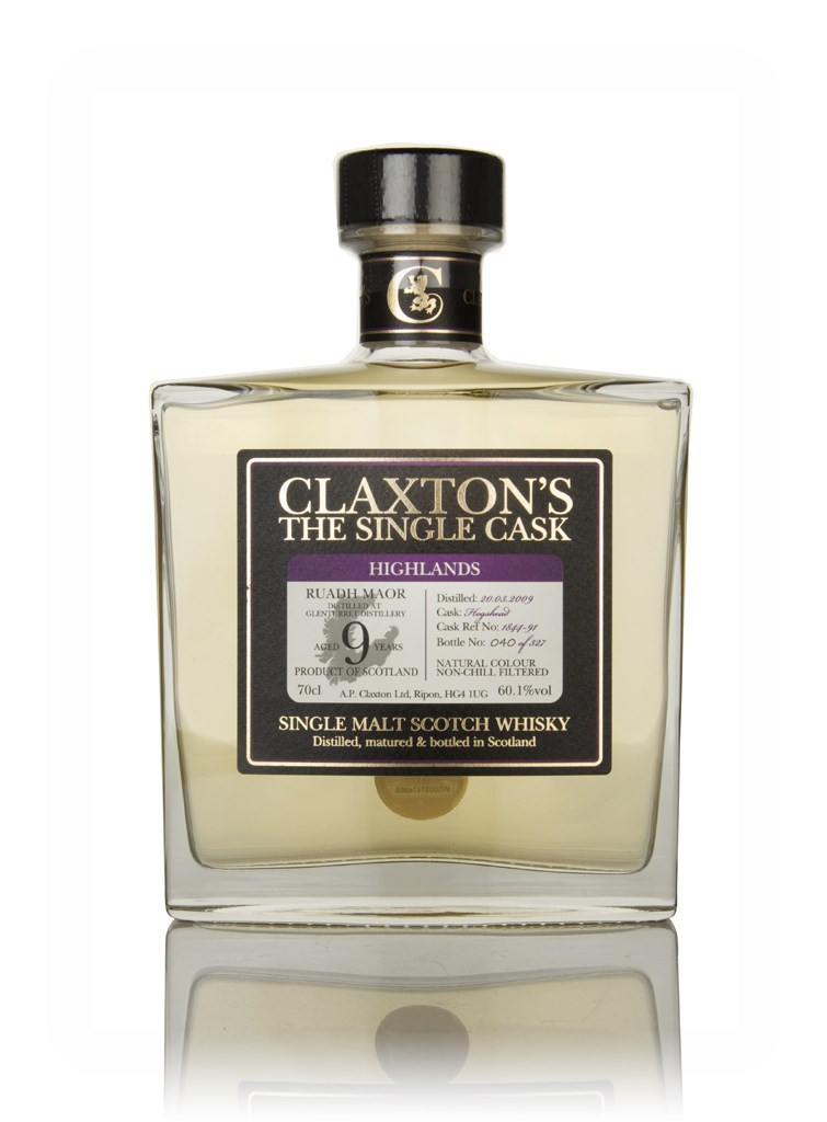 Glenturret single malt - but not quite as you know it. This right here is heavily peated whisky from Glenturret, released under the Ruadh Maor name and bottled by Claxton's. It was distilled in March 2009 and left to age in a single hogshead for 9 years before being bottled at cask strength. 327 bottles were produced.