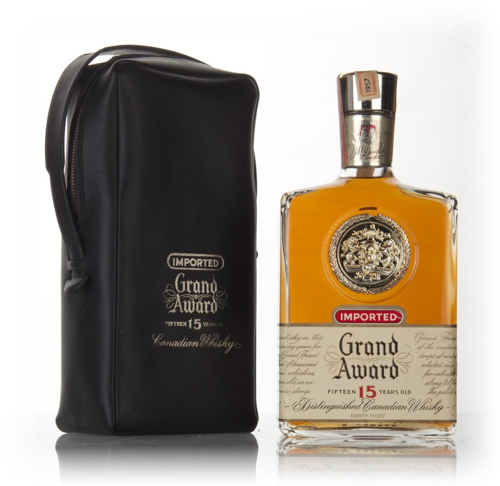 This is a rare bottle of Grand Award 15 Year Old Canadian whisky, distilled in 1957 and bottled in the early 1970s. A very fancy bottle, presented with its original satchel!