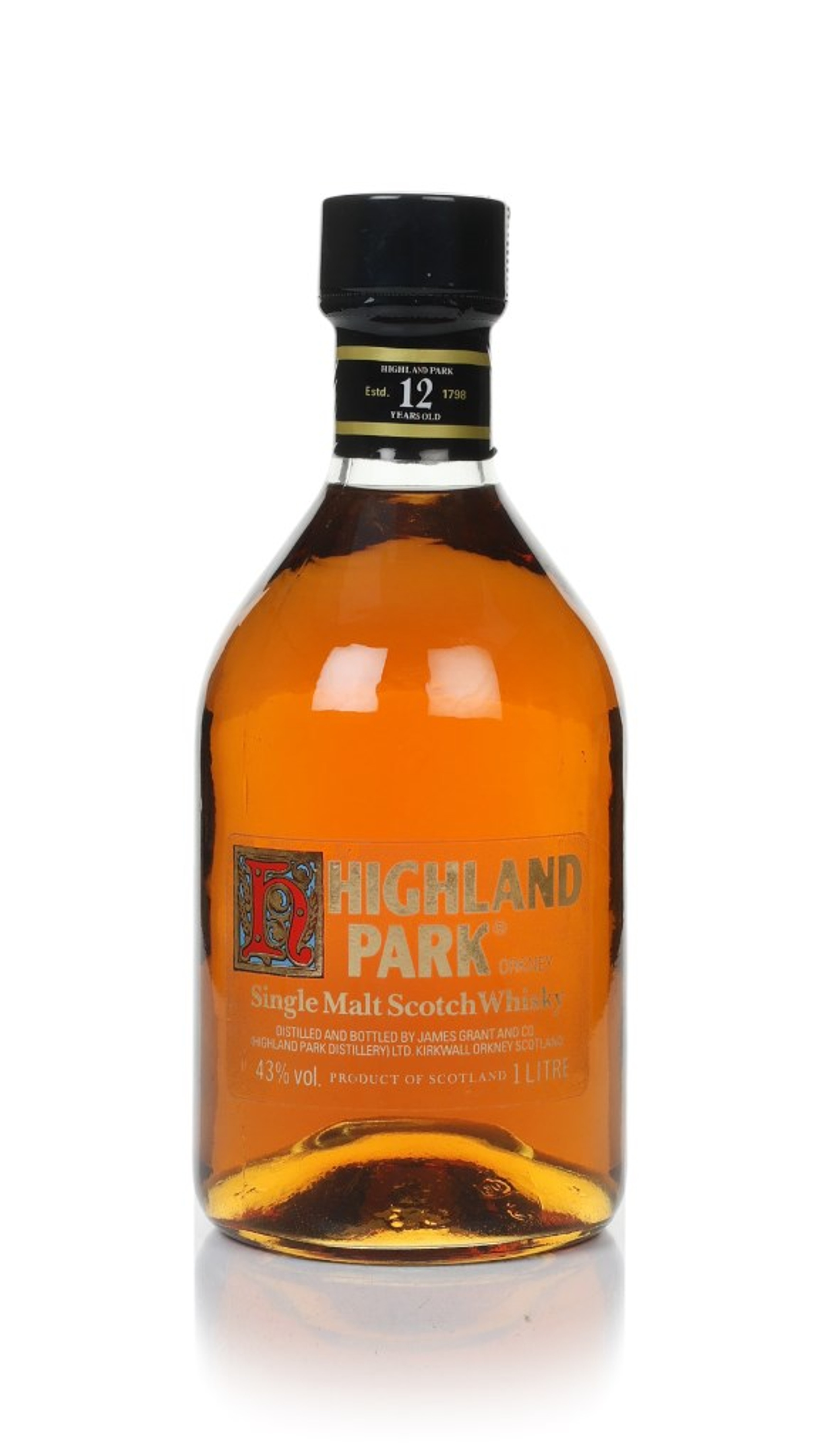 A satisfyingly chunky one-litre bottle of Highland Park 12 Year Old single malt Scotch, which dates back to the early 1980s! The clear label means the delicious malt within remains in full view, and we find it rather mesmerising.