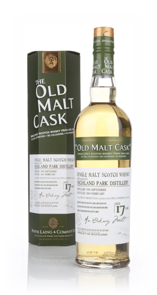 A golden, honey'd and joyfully smoky single cask bottling of Highland Park single malt Scotch whisky, bottled by Hunter Laing for the Old Malt Cask range. It was distilled on the Orkney islands in September 1996 and bottled by Hunter Laing in February 2014 with an outturn of 296 bottles.