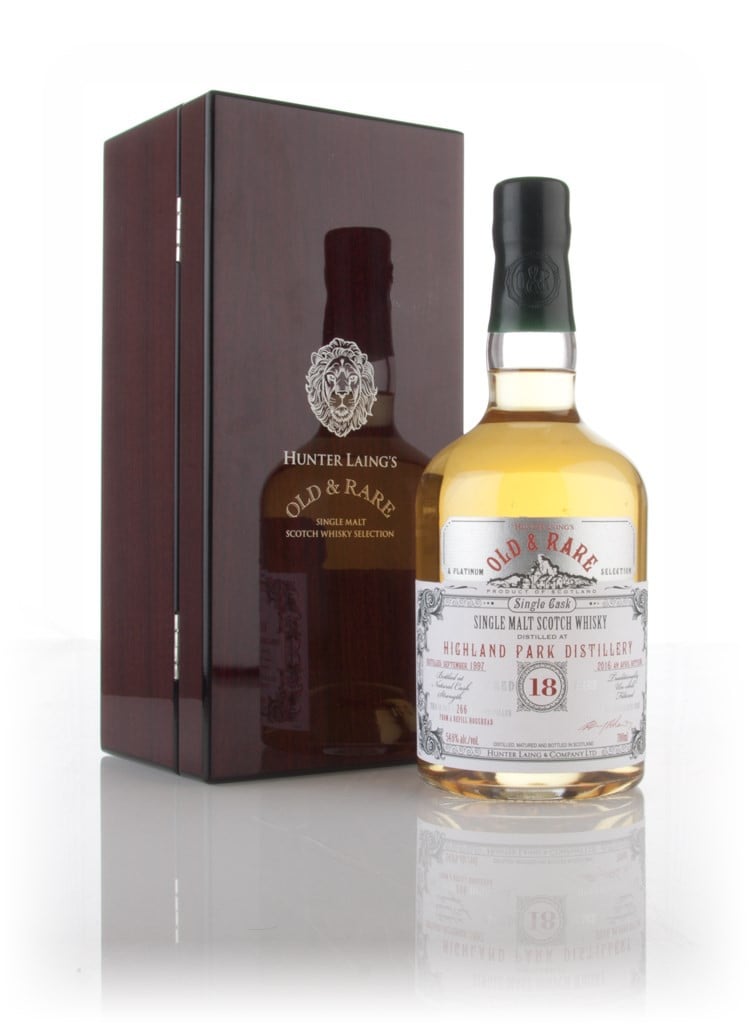 A single cask bottling of 18 year old single malt from the legendary Highland Park distillery on Orkney. This was distilled in September 1997 and bottled in April 2016 at cask strength. This was bottled by Hunter Laing for their Old & Rare Platinum range, with 266 bottles produced.